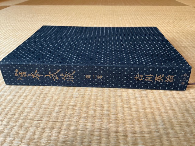 高校時代に読んだ本は、講談社の吉川英治全集17から18(昭和43年9月20日発刊)の宮本武蔵(一)から(三)だったと思う。全話が三巻にまとめられていたからだ。天の巻、地の巻、人の巻の三巻と思い込んでいた。それがいつの頃からか、高校時代に読んだ宮本武蔵は作者お気に入りの紺絣で表装された本だと誤解していた。糺の森の古本市に行くときもその版を探していたが出会ったことがなかったので、先日、ネットで探すことにした。なんと折良くメルカリで出品されているものを見つけ購入することができたのだ。それがここに掲げた写真である。こちらは同じ講談社ながら昭和37年12月15日発刊の五巻ものである。図書館から持って帰るにはとても大部の書物である。