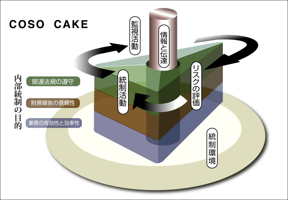 立方体と四角柱で表されているCOSOの内部統制に関するモデルを、内部統制が機能する事業単位という次元を立体モデルから外して、次のような皿に載ったチーズケーキの形で表現してみた。三角柱のモデルとなる。